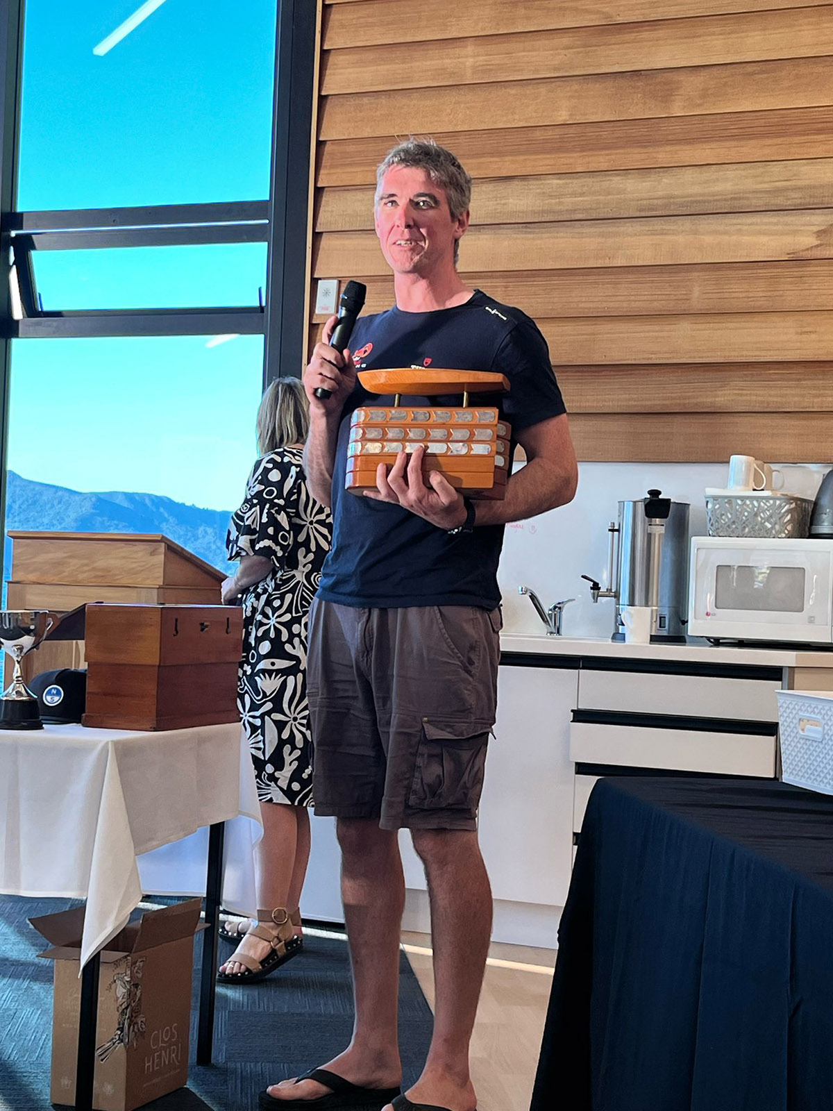 We woke up the next morning in regatta mode. Trent Pryce and Chris Fenwick had both had all keepers. We were going to be on the big course. Everyone had realized that they did not need to leave the boat club. The commodore, Meg Stetchman, happens to be married to the 2014 OK dinghy world champion and had seen to everything. Bacon and egg sandwiches in the morning, and great dinners in the evening with the bar and views. Some of the athletes had discovered a handy hiking trail from the yacht club for the legs. Some of the athletes had discovered the Irish pub after burgers the night before. The racing on day 2 established a clear pecking order. Sean, Steve, and Alistair Gifford (representing QCYC) took all podium spots from the three races sailed. Rod Davis came 4th in each race. The rest of the fleet was in a battle. No one truly managed to come away with three keepers out of the day. Gordon Sims bested the contenders but still took 21 points from the three races. Alistair Deaves picked all the shifts on the last race of the day to come 8th. Alistair Gifford won his first tiki, winning the last race of the day. He would go on to win the first race of day 3 as well, and his performance would see him on the podium and affect the championship.